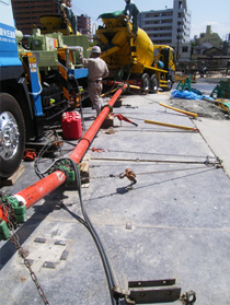 熊本 国道3号線にある作業所です。現場前面は歩道の為ポンプ車が設置が出来ない状況にあります。現場から50m程度はなれた場所にポンプ車を設置し、圧送配管を埋設し現場への圧送を可能にしました。(使用機種:PY115-26)