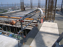 ![]() ④梁部の打設状況です。スラブと配合が違う為、梁を先に打ち上げます。(高流動生コンの為、ラスで仕切りを入れて止めてあります。 |