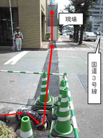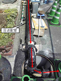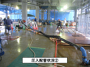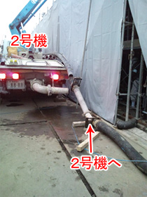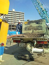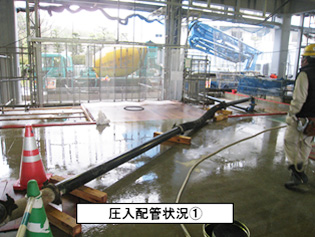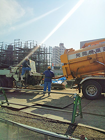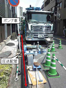 → | ![]() ③ 地中で道路を横断し、仮囲いの中で地上へ出て、上階に圧送されます。 |