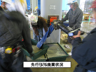 埋め戻しの工期短縮のため、躯体コンクリートと矢板の間にバキューム車からセメントが入ったドロを打設しました。次の日には人が乗れます(強度3N)