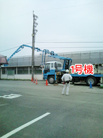![]() ①ポンプ車設置状況です。 配管が動かない様に鉄板等からガッチリ固縛しています |